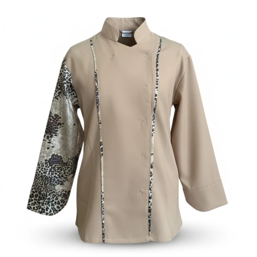 Bej Aşçı Forması Tek Kollu ve Ön Leopar Desenli Keten Kumaş