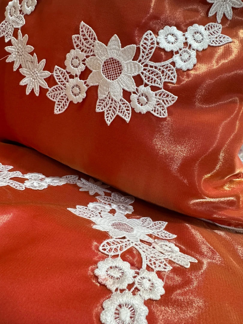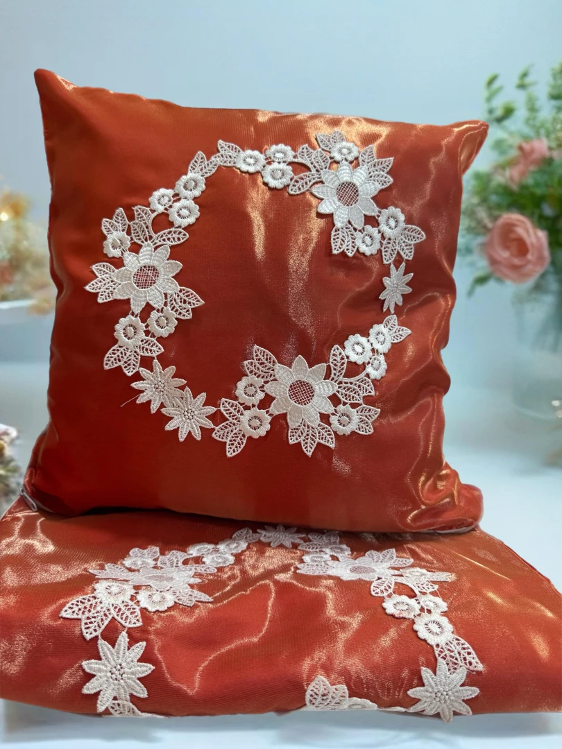 Parlak ve yumuşak saten kumaş üzerine zarif dantel detaylarıyla hazırlanmış özel tasarım kırlent. 45x45 cm ölçüsüyle yaşam alanınıza şıklık ve zarafet katar. Klasik ve romantik dekorasyon stilleri için ideal bir tamamlayıcıdır.