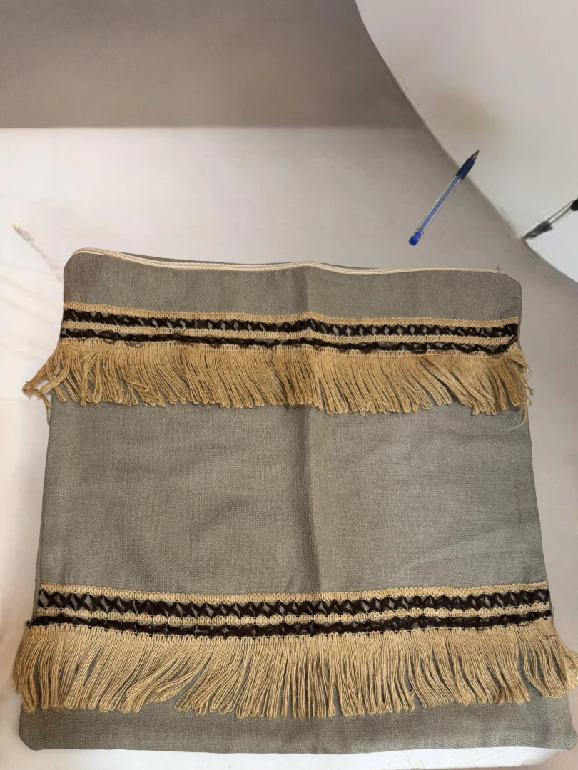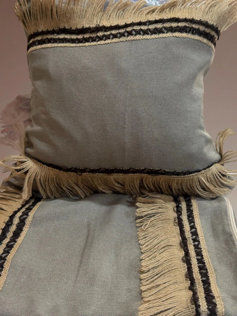 Doğal keten kumaş üzerine işlenmiş Hint tarzı püskül detaylarıyla tasarlanmış şık ve özgün bir kırlent. 45x45 cm ölçüsüyle yaşam alanınıza etnik ve sıcak bir hava katar. Bohem ve etnik tarz sevenler için ideal bir dekor parçası.
