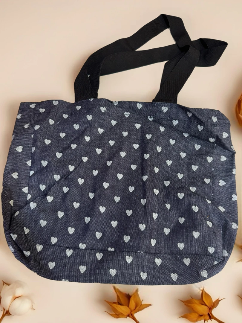 Doğal keten kumaş üzerine işlenmiş lacivert kalp desenleriyle tasarlanmış özel çanta. Hem sevimli hem şık bir görünüm sunar. Günlük kullanıma uygun, hafif ve dayanıklıdır. Toplam 9 adet, fiyat 850₺