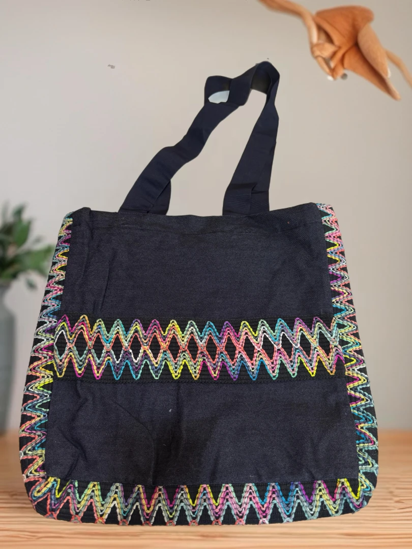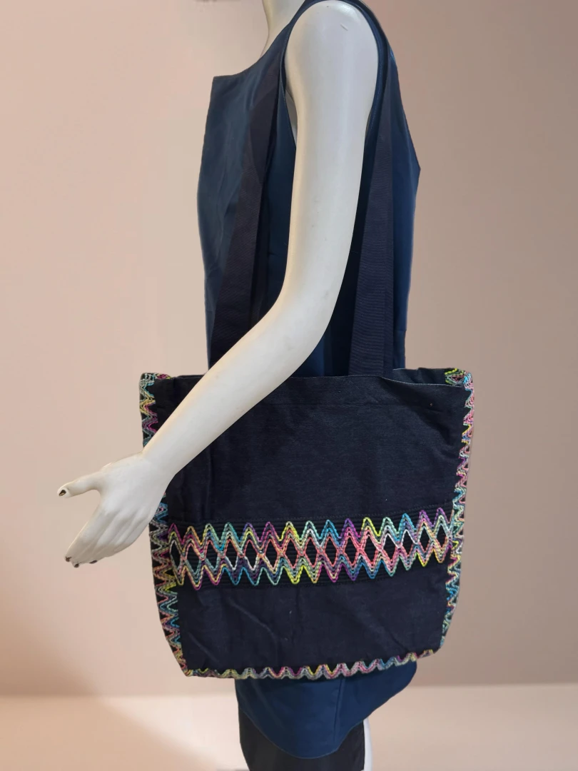 Lacivertin derin ve sakin havası, rengârenk kenar detaylarıyla canlanıyor. Günlük stilinize hareket, enerjinize renk katacak bu çanta; özgün ve neşeli tasarımıyla fark yaratmak isteyenler için ideal bir parça.