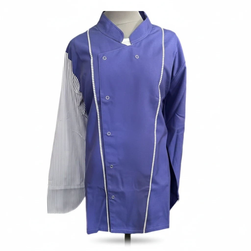 Mor Aşçı Forması Tek Kollu ve Ön Çizgi Desenli Keten Kumaş 1200₺